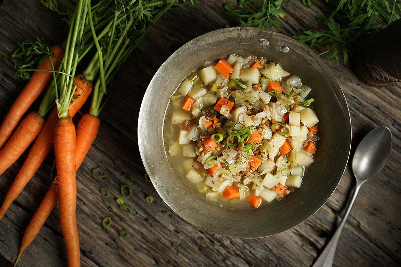 This simple, satisfying lentil stew is easy and versatile. Add in your favorite vegetables or whatever you have in the fridge and your favorite spices for flavor.