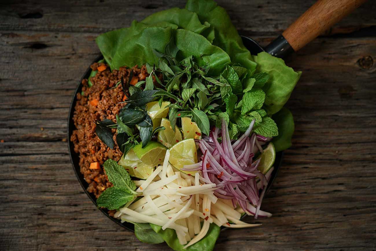 These fragrant, crunchy, delicious Thai lettuce wraps come with all your favorite Thai flavors and a hearty plant-based beef filling.