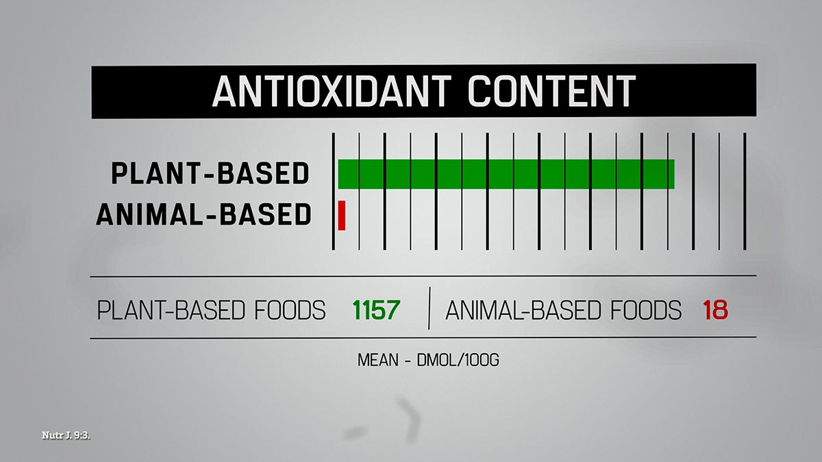 Plants fall on the opposite end of this spectrum, coming naturally packed with high doses of anti-inflammatory compounds, including thousands of powerful antioxidants. The contrast between these two classes of food is dramatic, with plants having on average 64 times the antioxidant content of animal foods (28). This helps explain why switching to a plant-based diet can help reduce measures of inflammation by 29 percent in just three weeks (29).